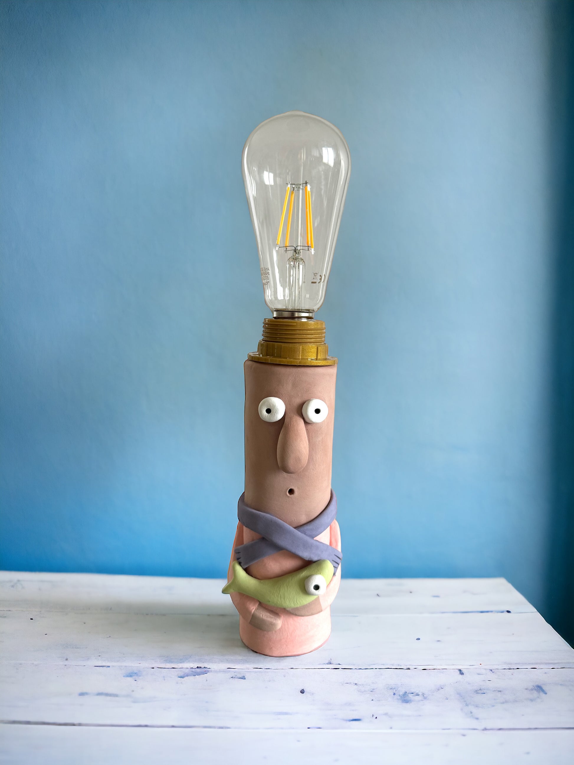 Nel cuore dell'arte ceramica, il nostro simpaticone con un grosso pesce, una lampada unica nel suo genere realizzata artigianalmente con passione.