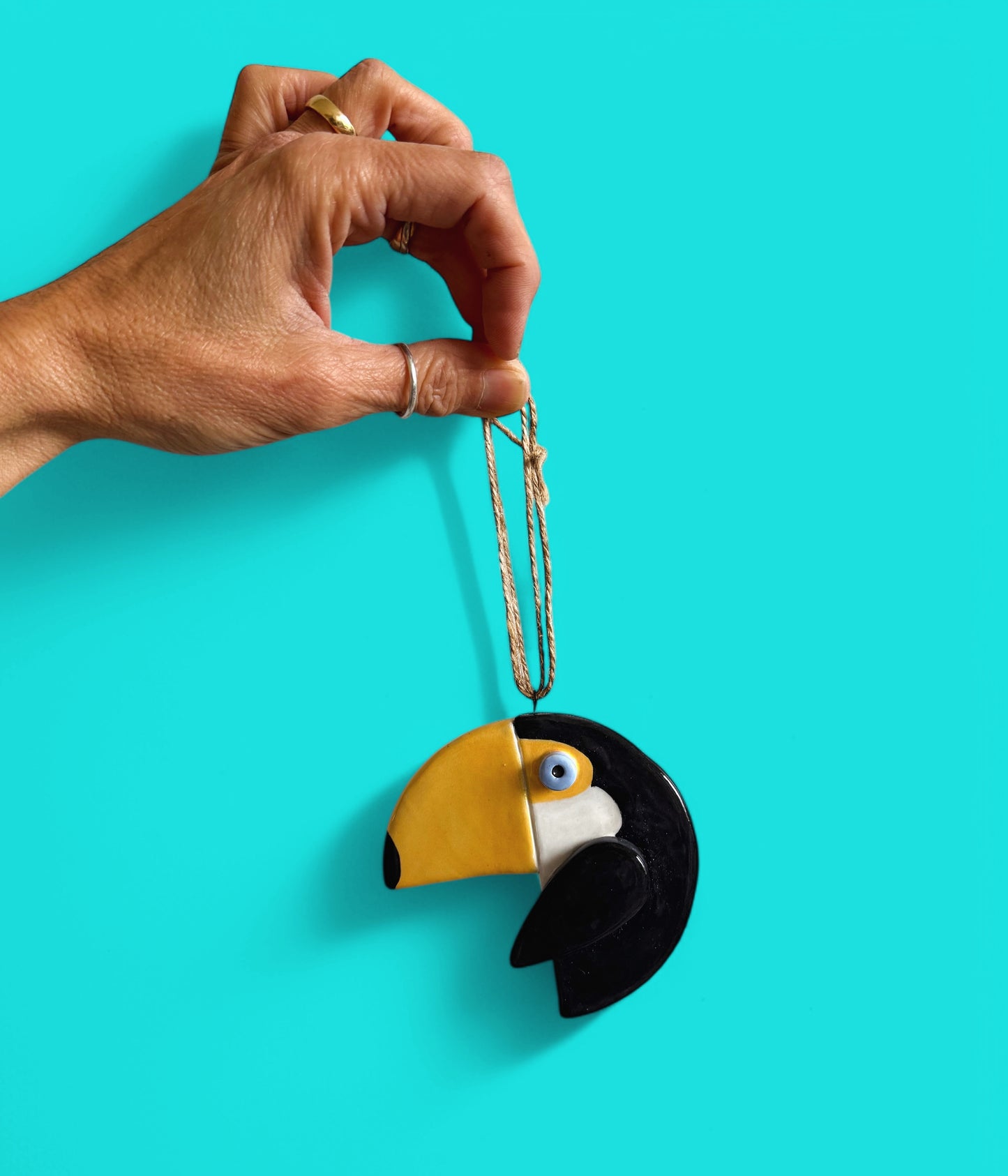 Realizzato a mano in ceramica e rifinito con un cordino naturale, ogni tucano è unico e ricco di personalità. La smaltatura aggiunge un tocco morbido e vibrante che fa risaltare i colori, proprio come l'uccello stesso.