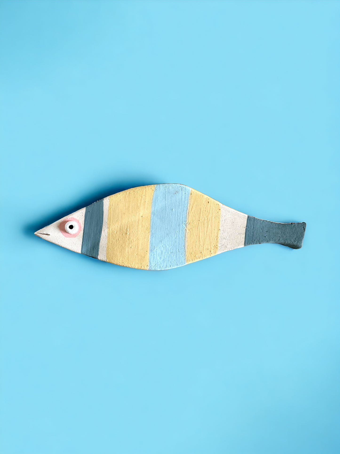 Con una lunghezza stravagante di 20 cm, questo pesce in ceramica è un vero spettacolo, pronto per aggiungere un tocco di personalità al tuo spazio. Che sia appeso al muro o appoggiato su uno scaffale, porta un oceano di allegria ovunque vada. Realizzato artigianalmente con gusto in Italia, ogni pesce è un capolavoro in miniatura, che promette di trasformare l'ambiente circostante in un vibrante paese delle meraviglie sottomarino.