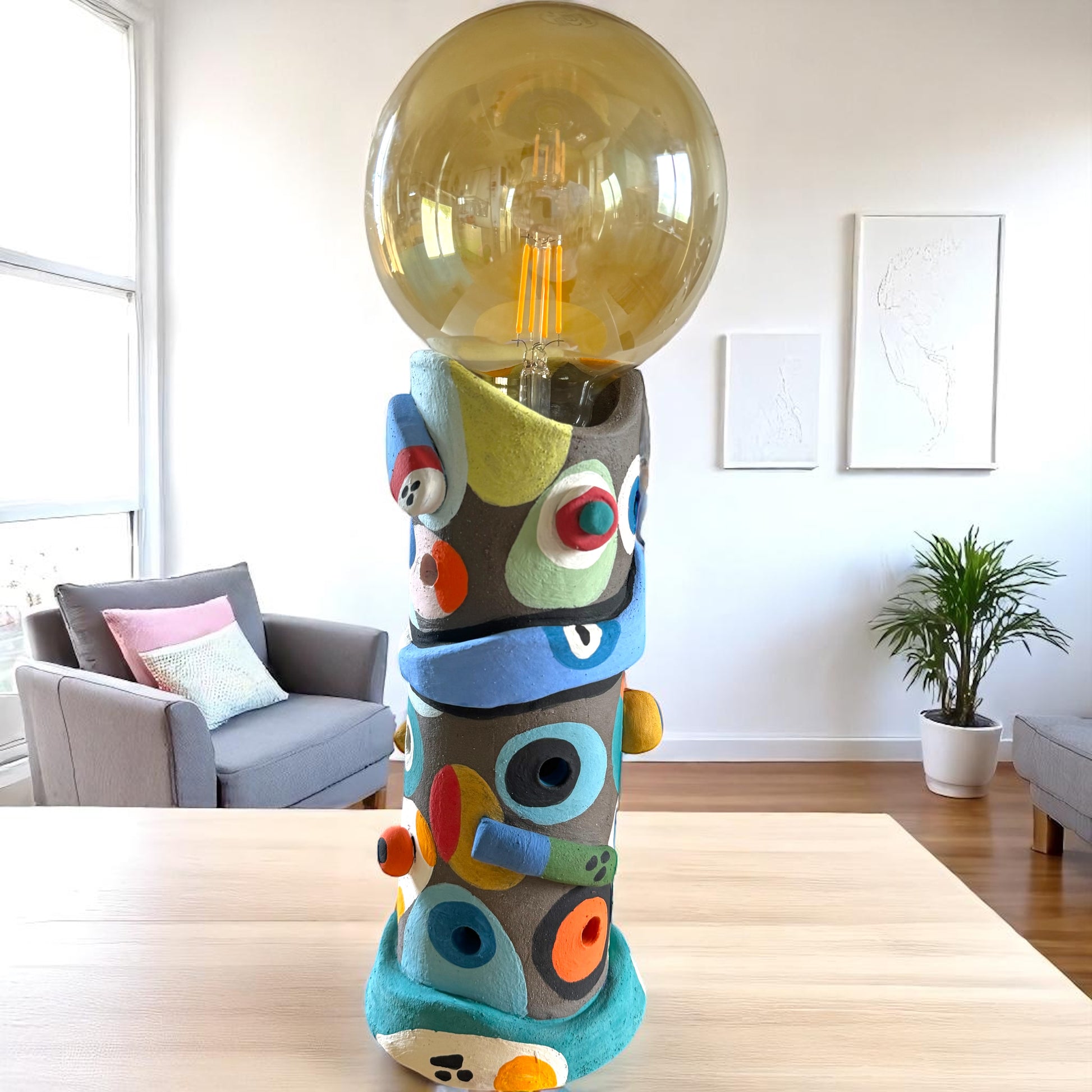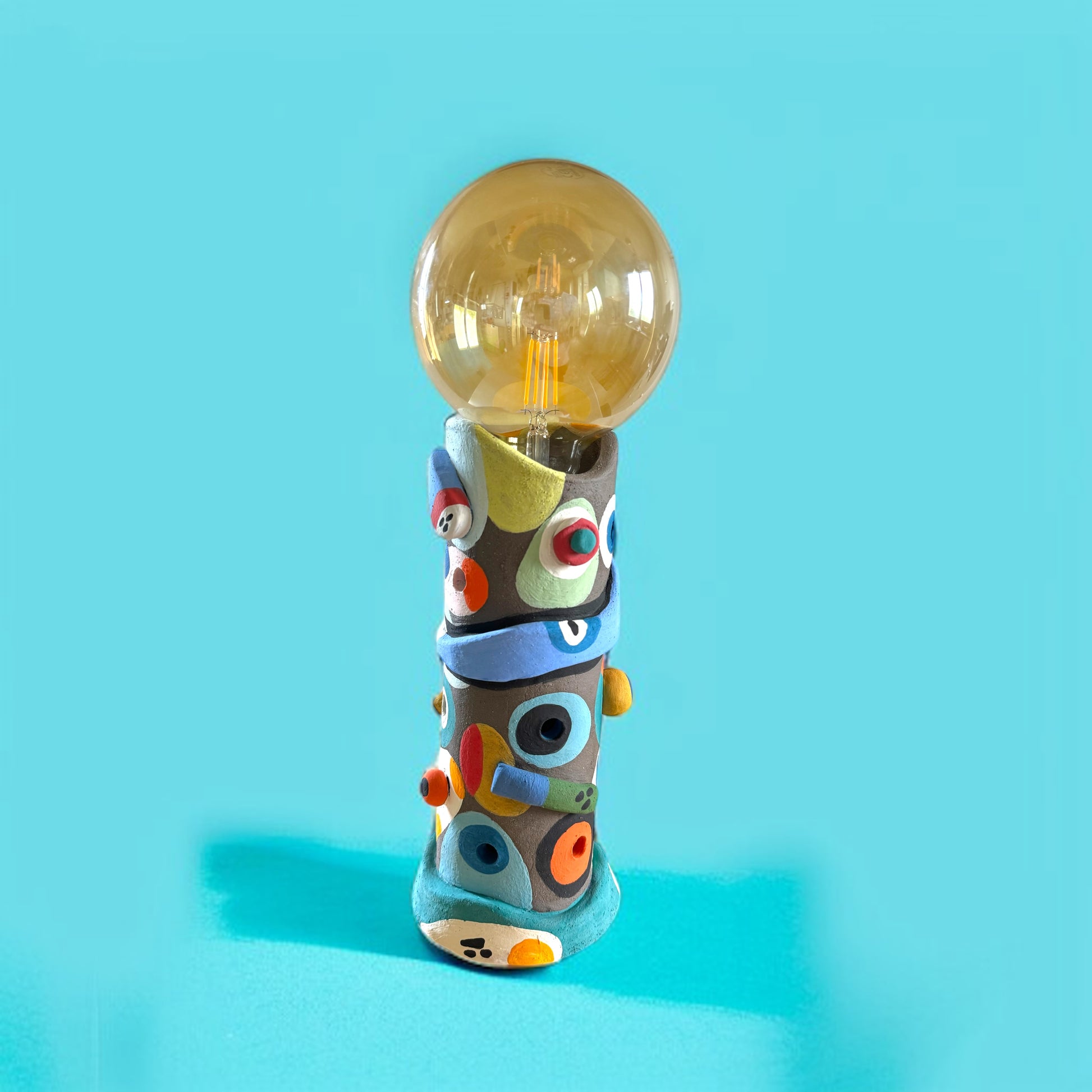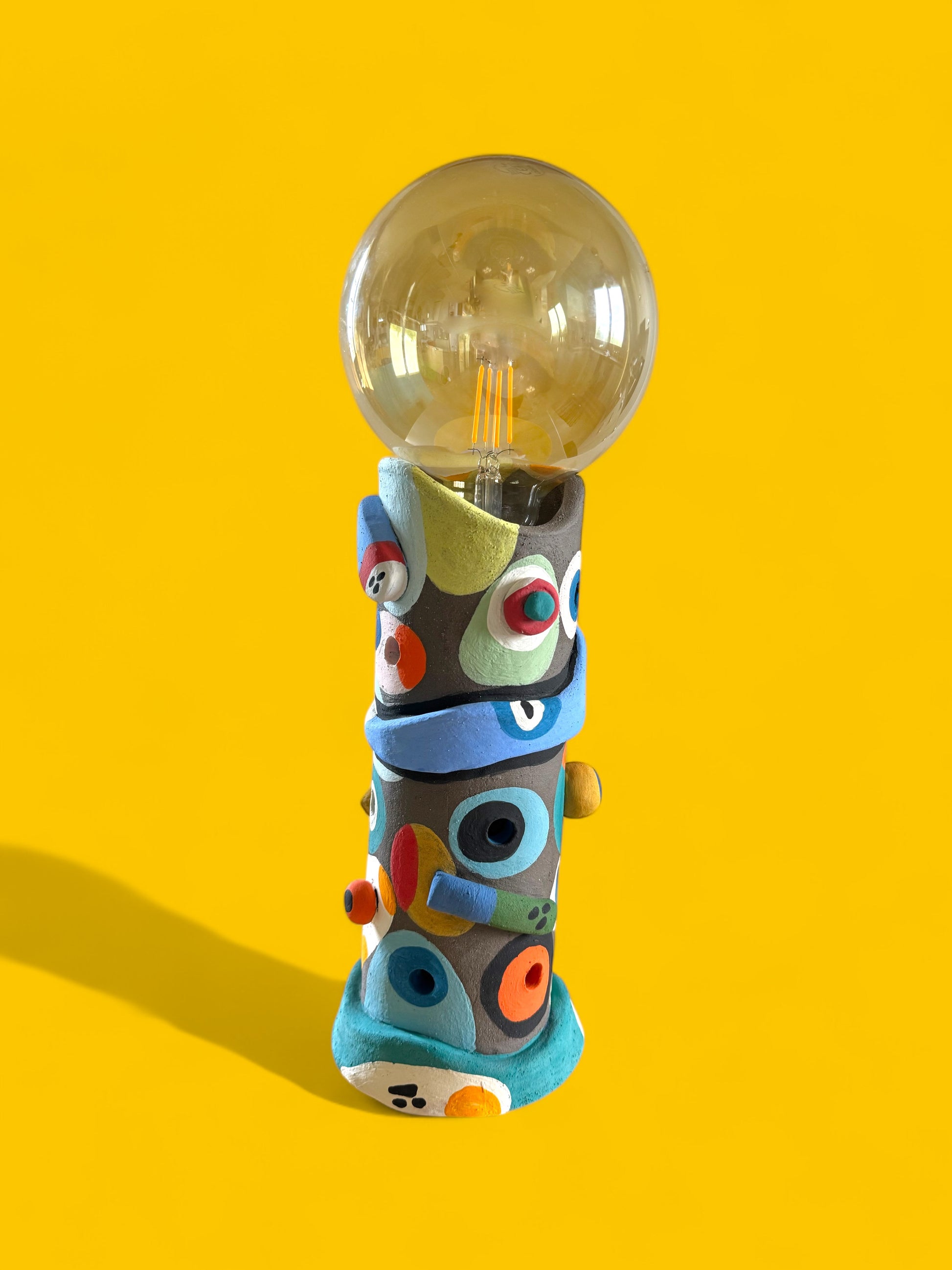 Hand-built in textured chamotte clay and painted with bold underglazes, it stacks up like a psychedelic totem from a parallel dimension: all eyes, bubbles, planets and pop-colored beats.
