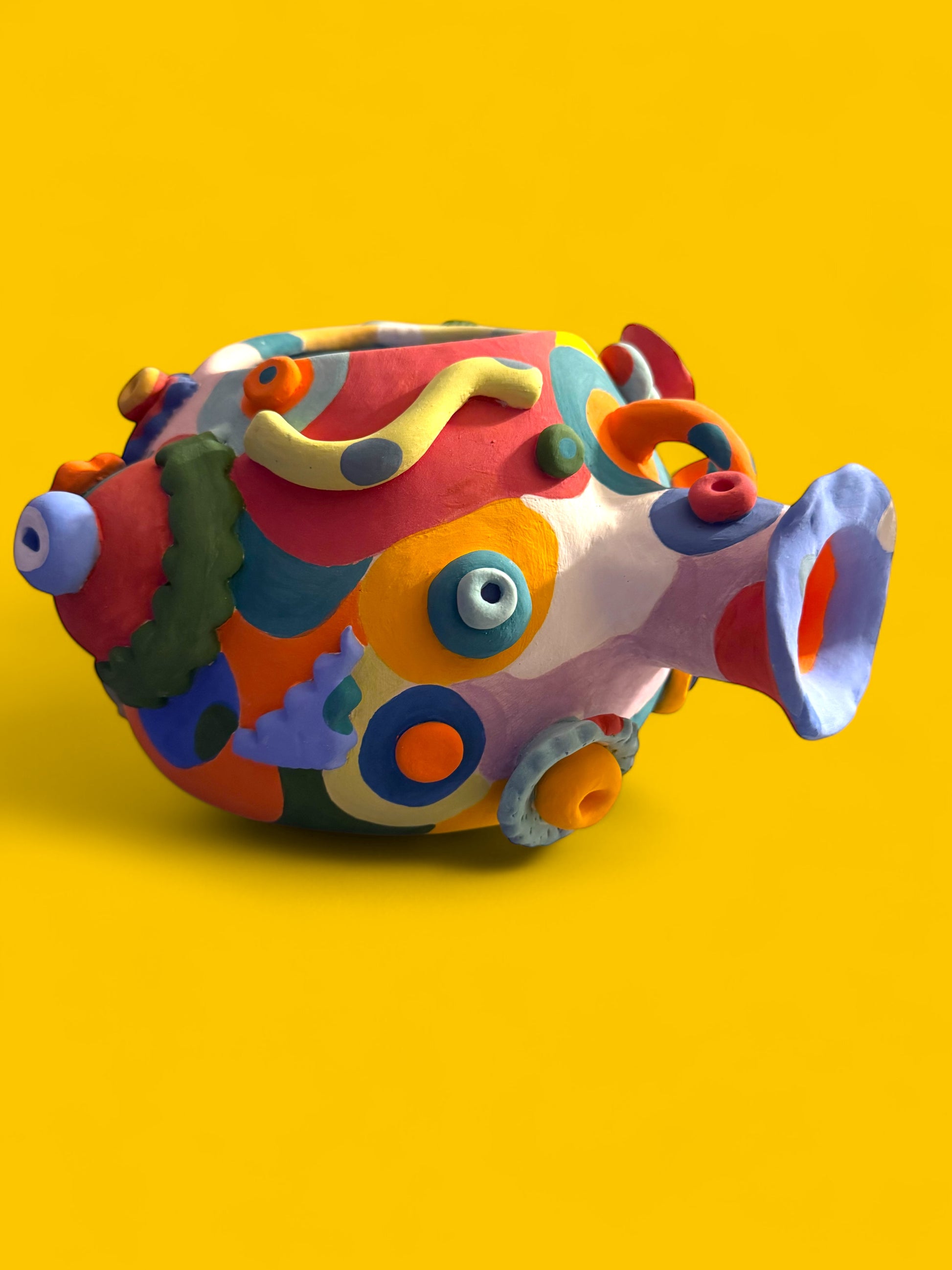 This hand-built ceramic creature is a joyful explosion of shapes and colors—tentacles, bulges, craters and blossoms that twist and sprout like a psychedelic reef from another planet.