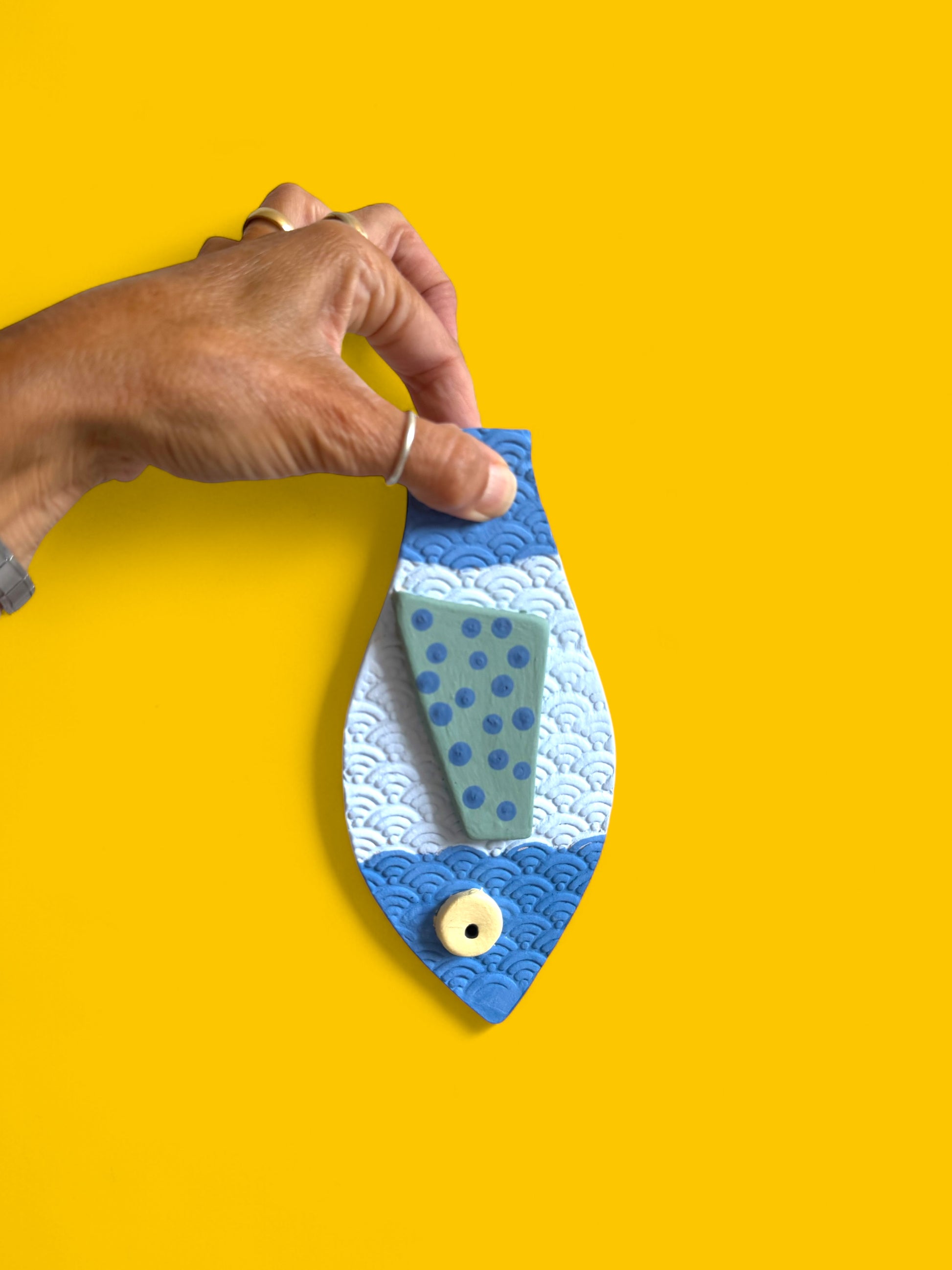 With the tail of a fish and the sail of a boat, this quirky ceramic creature floats between land and sea, reality and imagination. Its bold colors and surreal design make it feel like a postcard from a place that doesn’t exist — but should.